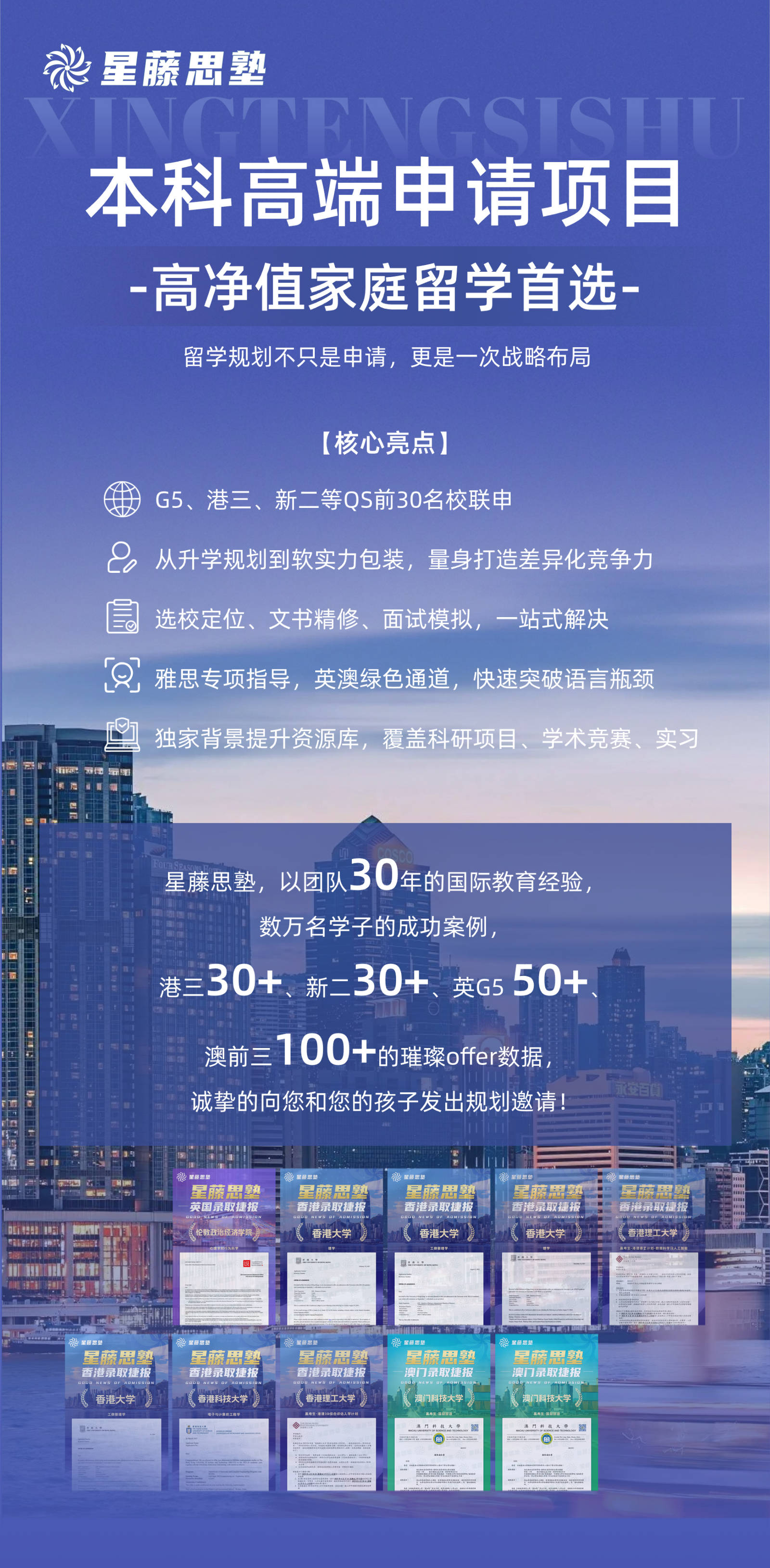 星藤思塾申请支持:通过背景提升实现加分优待,帮助学生最大化发挥高考成绩优势,从精准选校定位、文书背景优化,到全真模拟面试指导,星藤思塾专业团队全程陪伴,在港校激烈竞争中脱颖而出。