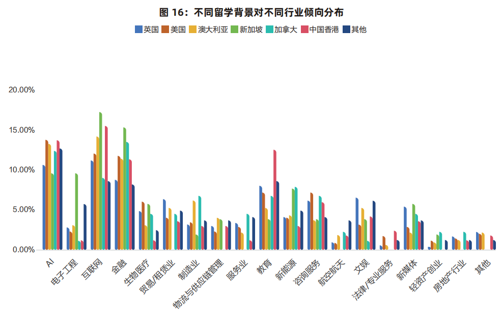 • 香港留学生,更偏向互联网(17.22%)、AI(15.23%)和教育(13.91%)。