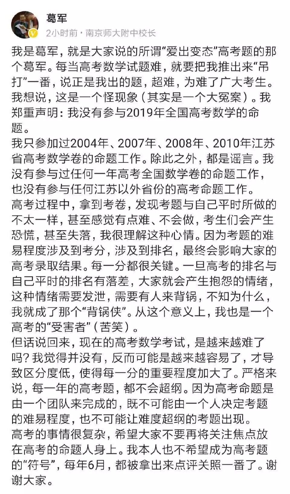 而让人哭笑不得的是,每年只要数学考试难度大,很多考生都会“归罪”于葛军老师。在2019年高考数学难倒一片考生后,葛大爷被逼得专门注册社交平台账号发文辟谣:我只参加过2004年、2007年、2008年、2010年江苏省高考数学卷的命题工作,其他的都是谣言!